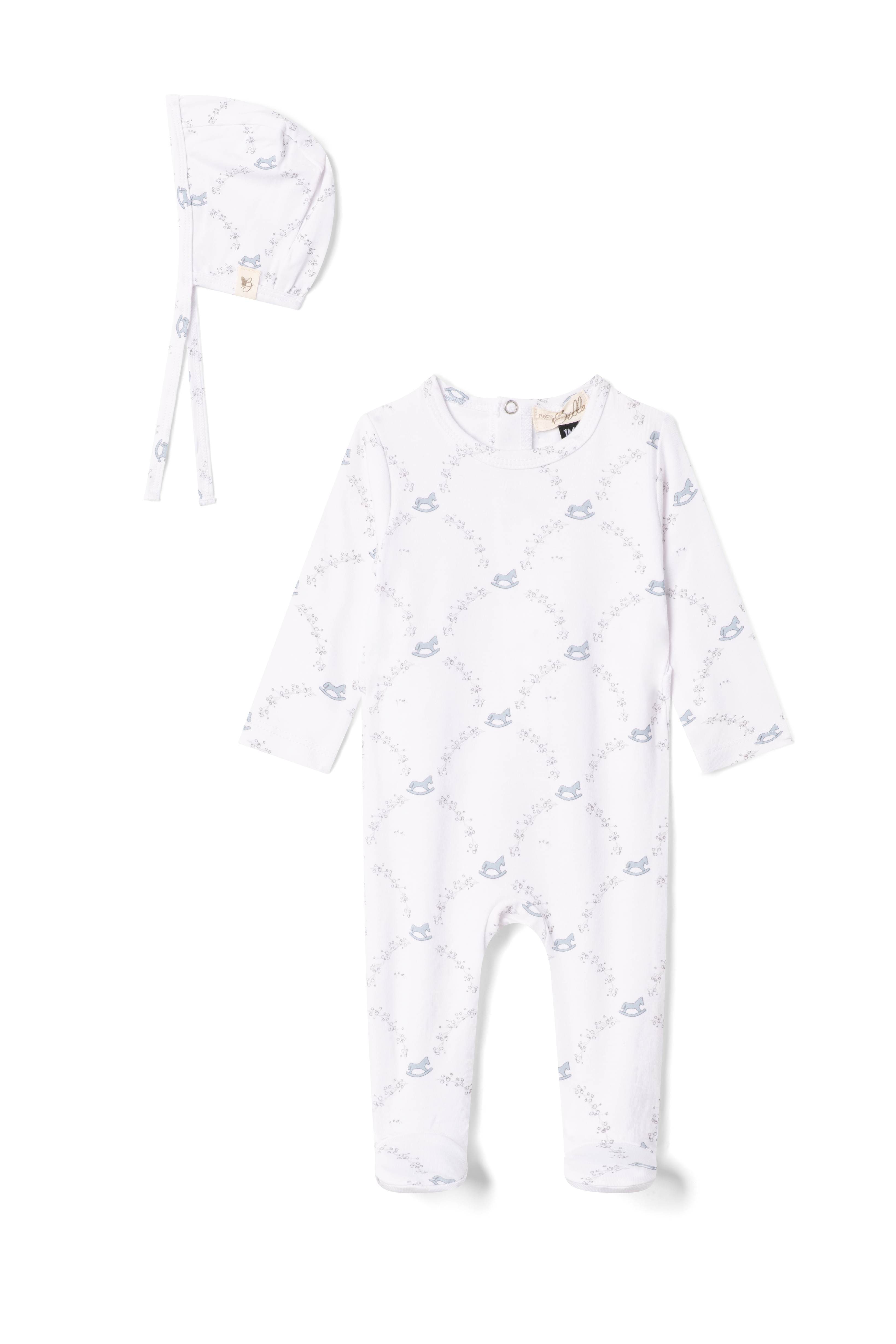 BEBE BELLA 2PC ROCKING HORSE PRINT FOOTIE WITH BONNET SET